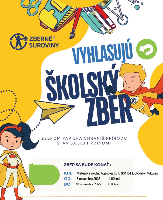 V dňoch 6.novembra až 10.novembra organizujeme ZBER PAPIERA. Papier je treba zviazať, odvážiť a množstvo nahlásiť v kmeňovej triede dieťaťa. Papier sa bude vhadzovať do pristaveného kontajnera v priestore pred hlavným vchodom do MŠ.